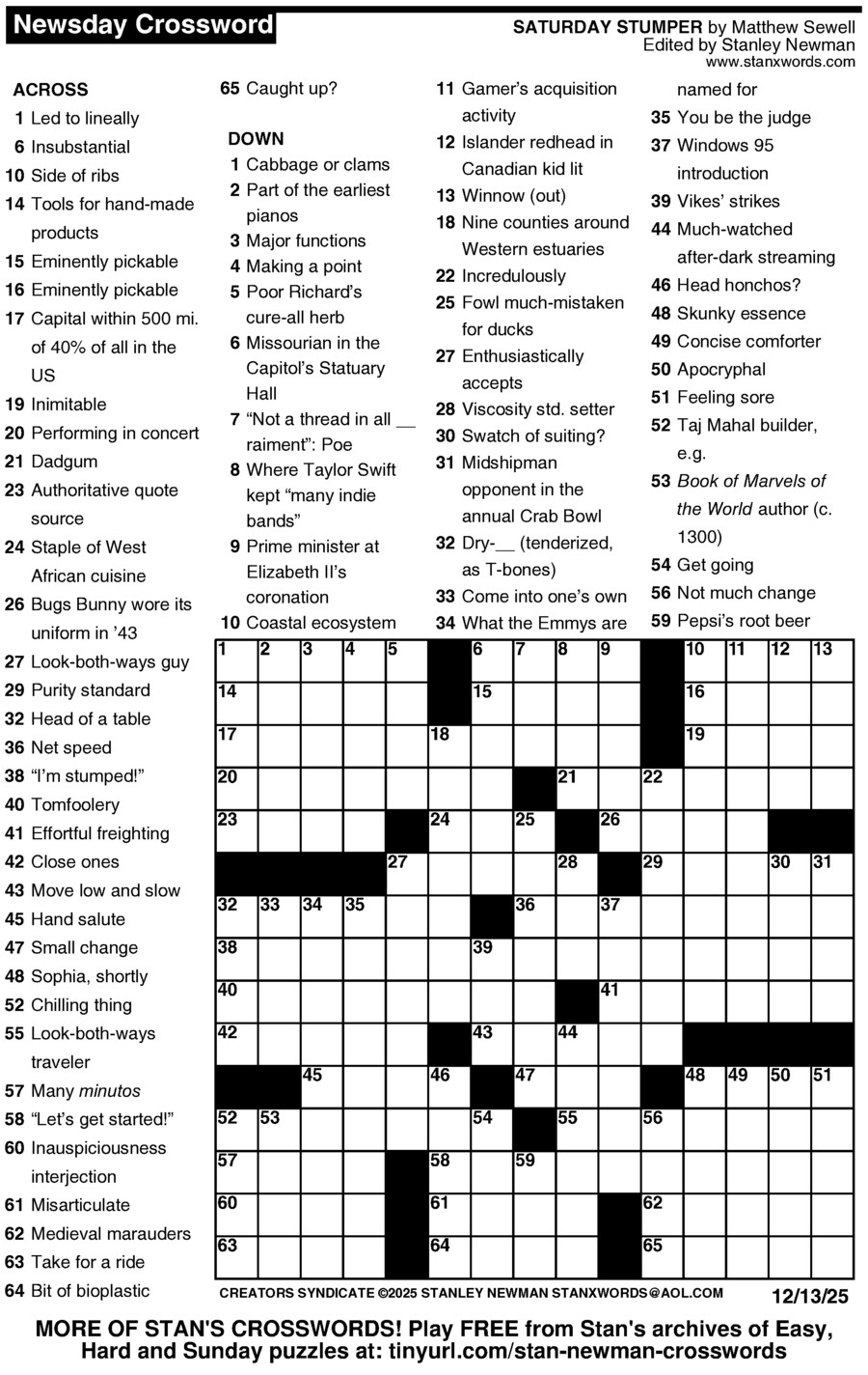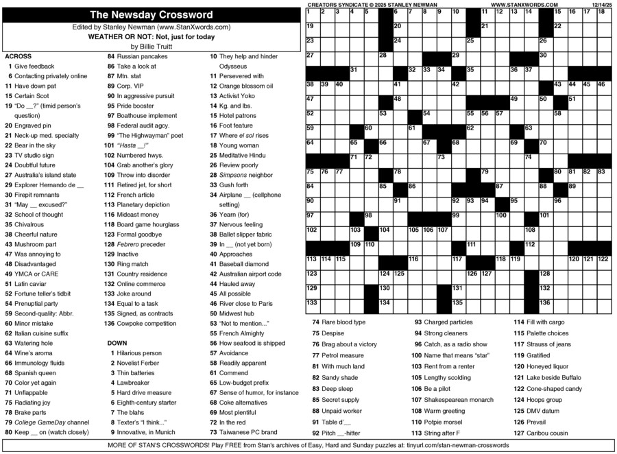 Because free access to the content of Newsday.com is available only to Newsday subscribers and customers of Cablevision (Newsday’s owner), many thousands of puzzle fans, spanning six continents, get the Newsday Crossword free every day right here at Stan’s Crossword Land.