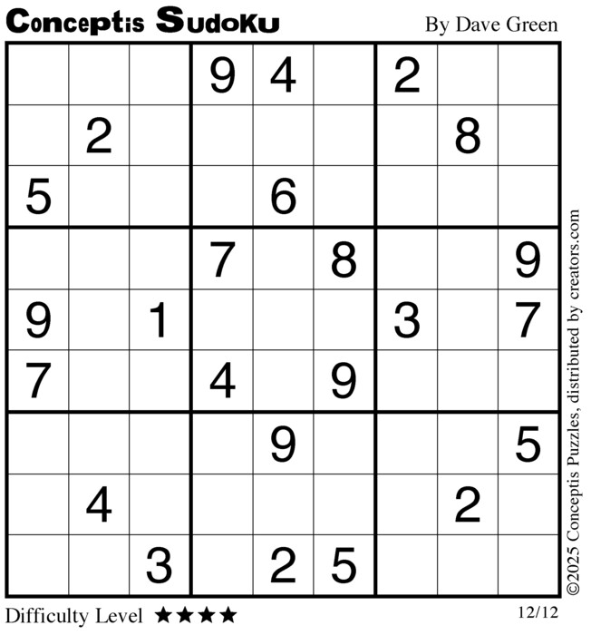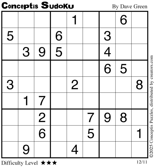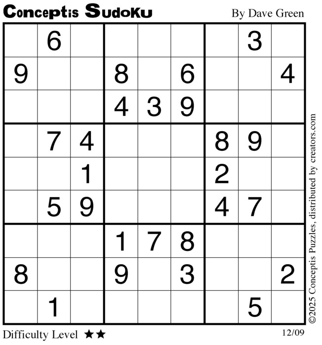 Each puzzle consists of a 9x9 grid containing given clues in various places. The object is to fill all empty squares so that the numbers 1 to 9 appear exactly once in each row, column and 3x3 box.