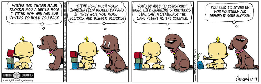 The "Dog" in the title refers to Sophie, a female chocolate lab and Doug is the baby of Sophie's owners. The two share a love-hate relationship in their everyday lives and imaginations, with Doug often responding to Sophie's actions by saying "Bak!" Doug's parents also make appearances in the strip as minor characters, though they are only seen from the neck down.